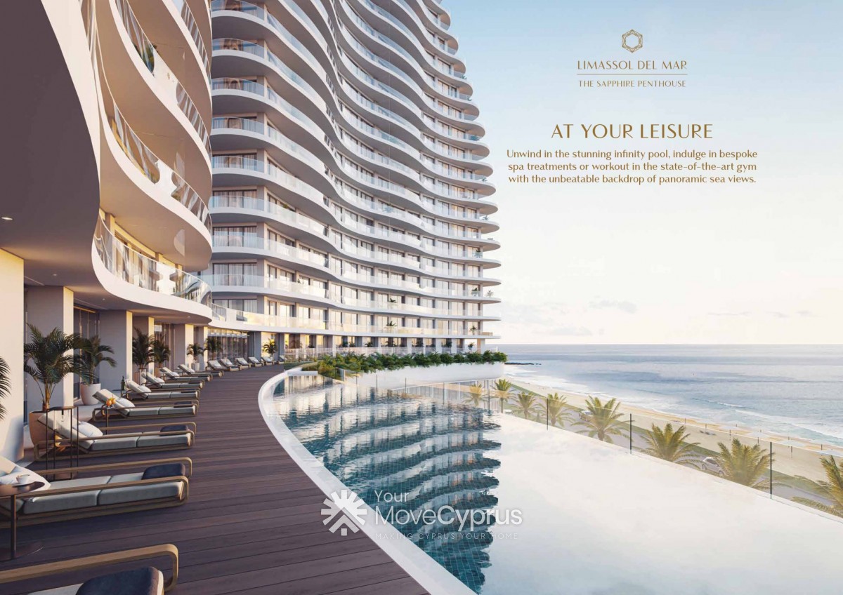 is a Seafront 5-bedroom duplex penthouse apartment that enjoys breathtaking views of the Mediterranean Sea at every angle. Being part of Limassol Del Mar, it expresses the island’s ‘new wave’ of architecture through its unique high-rise curvilinear design, which fully capitalises on the plot’s long sea frontage.