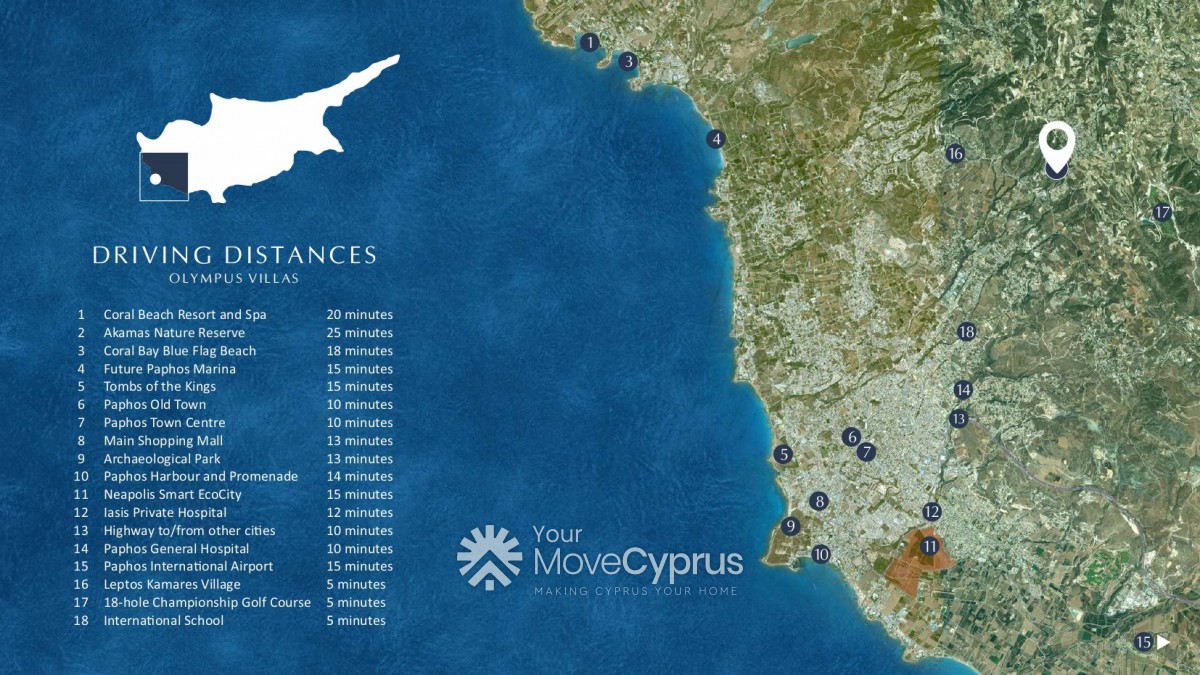 The picturesque landscape provides sweeping vistas of the sea, while being just a short drive away from the vibrant city center. With the renowned Leptos Olympus Village and Leptos Kamares Village being a mere 5 minutes away, residents can enjoy the benefits of a well-established and thriving community. Moreover, the property is in close proximity to an 18-hole international championship golf course, offering a haven for golf enthusiasts. Additional amenities such as private and public schools, as well as various services, can be easily reached within a short drive, whilst the popular Paphos Tourist Area is only 15 minutes away.